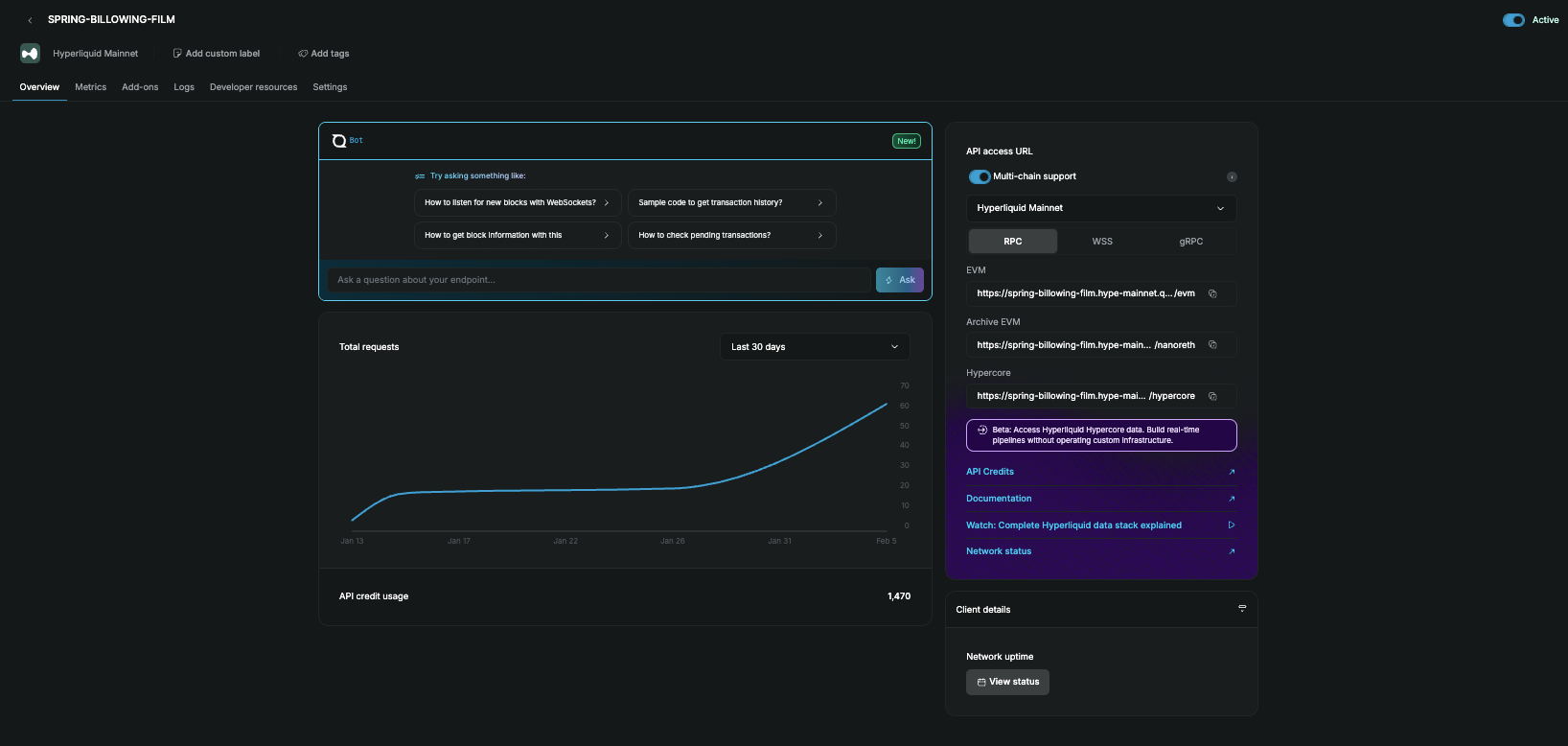 If you're building trading infrastructure, market-making systems, or real-time analytics that need HyperCore data, Quicknode gives you the most complete package: seven HyperCore data streams with native zstd compression, filtered per-market push delivery via Streams, gRPC with sub-millisecond latency, and full historical archive access, all through a unified endpoint that also serves HyperEVM. The HyperCore public beta is included on all paid plans starting at $49/month with no add-on. For teams that need enterprise compliance (SOC 1, SOC 2, ISO 27001) and a 99.99% uptime SLA backed by 5T+ requests served in 2025, it's the most production-ready option. Dwellir is worth considering if you specifically need L4 order book depth and co-located execution in Singapore or Tokyo, though their HyperCore gRPC is more limited (3 stream types, 24hr retention, no native compression) compared to Quicknode's full offering.