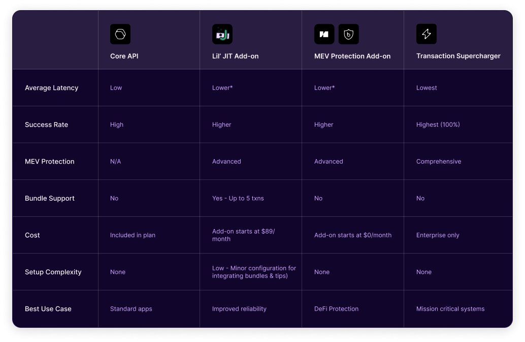 Best for: Applications requiring improved transaction success rates, complex transaction bundling, and the ability to adapt to market-driven tip economics. Ideal for use cases where execution certainty justifies flexible spending on variable tip rates (e.g., arbitrage) and when you need to send up to 5 transactions to be executed sequentially/atomically (a bundle).
