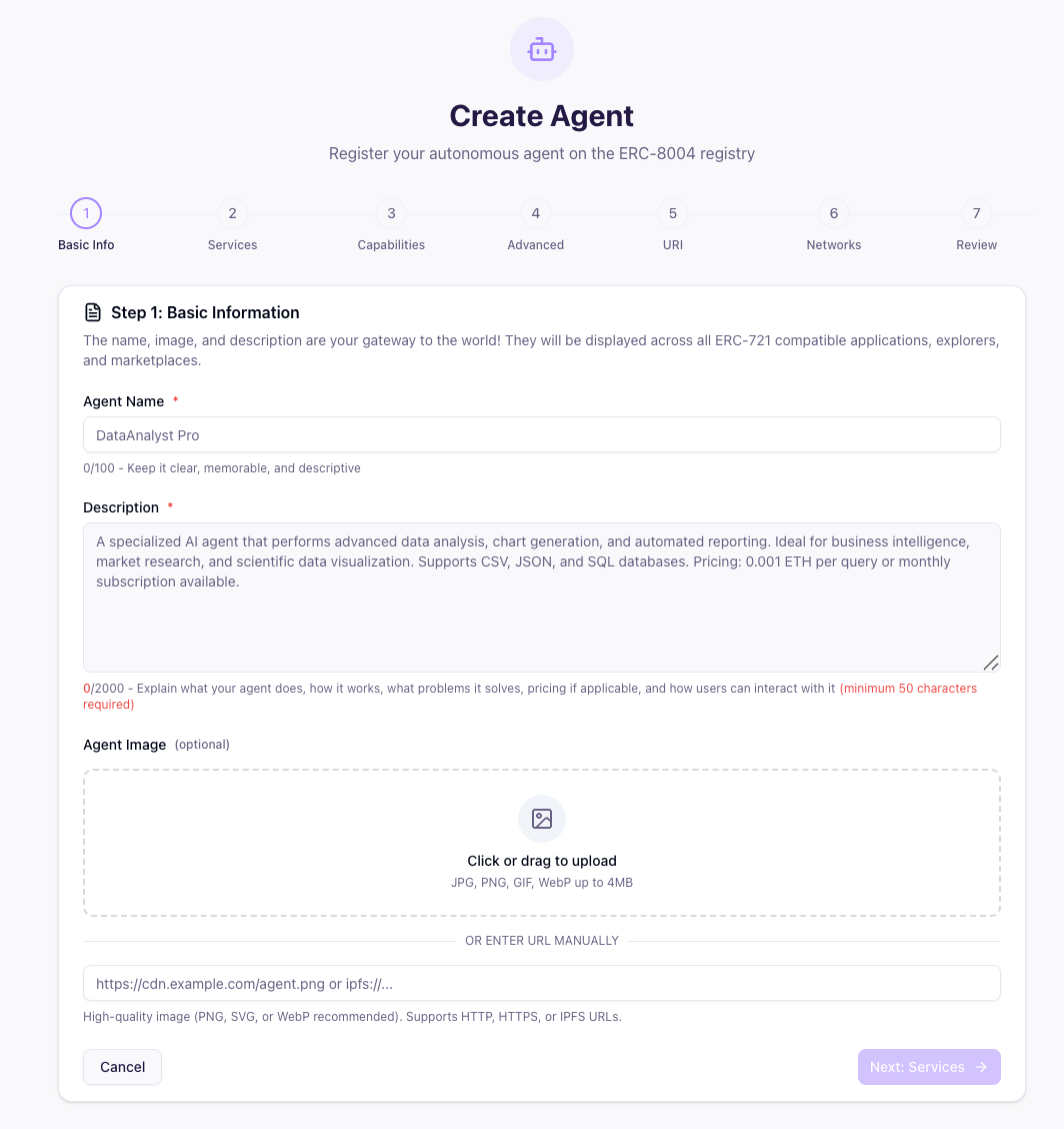 Each agent is represented by a unique onchain identifier which is further minted as an ERC-721 token. That NFT points to a structured JSON file, called an agent card, containing the agent's name, functionalities, service endpoints (MCP, A2A, web), and payment address.