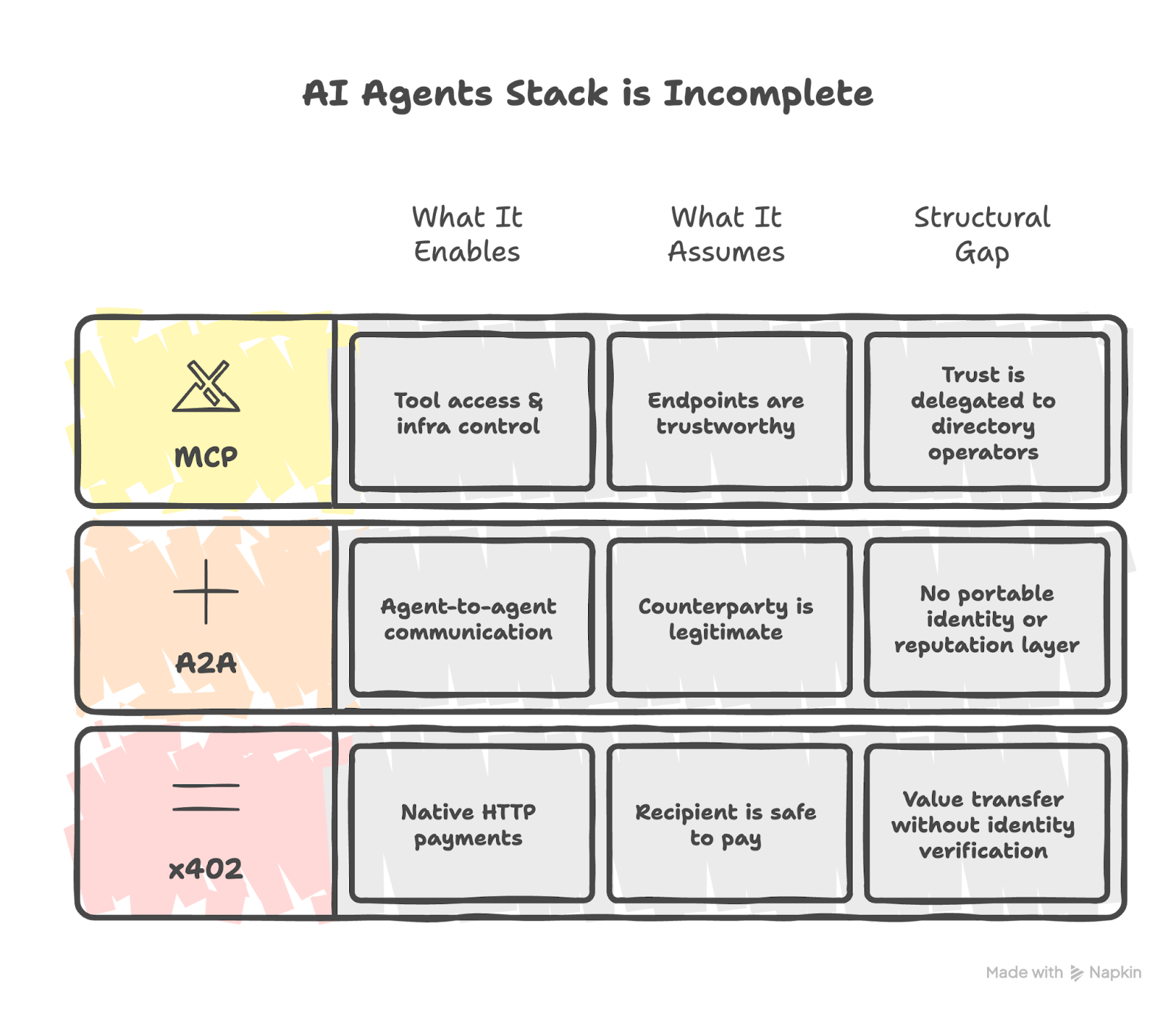 Simply put, these protocols do not have the capability to answer who the agent is. That's the gap ERC-8004 is built to close.