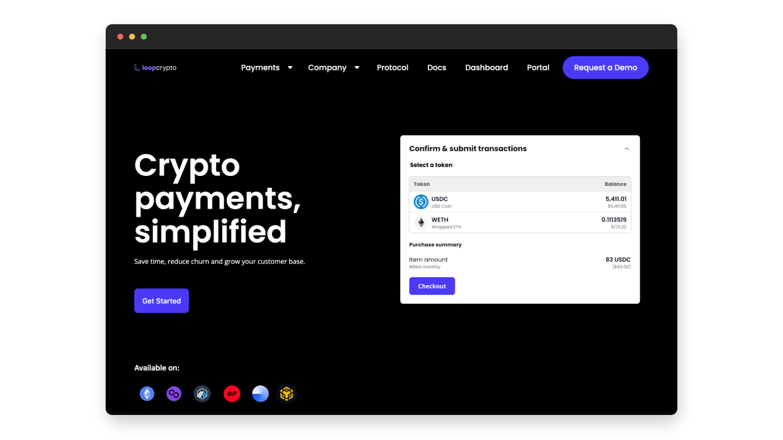 Loop Crypto is designed for businesses that intend to process subscriptions, invoicing, and payment schedules in crypto. Whether you're disbursing or receiving crypto, Loop can refine your procedures and significantly reduce time spent on reconciliations and automation.