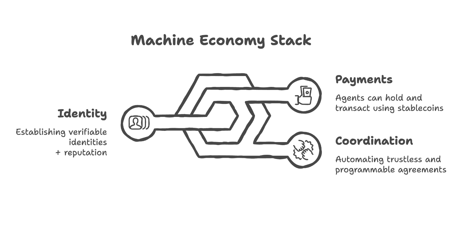 The machine economy is an economic layer where AI agents hold assets, transact value, enter into contracts, and execute tasks autonomously.