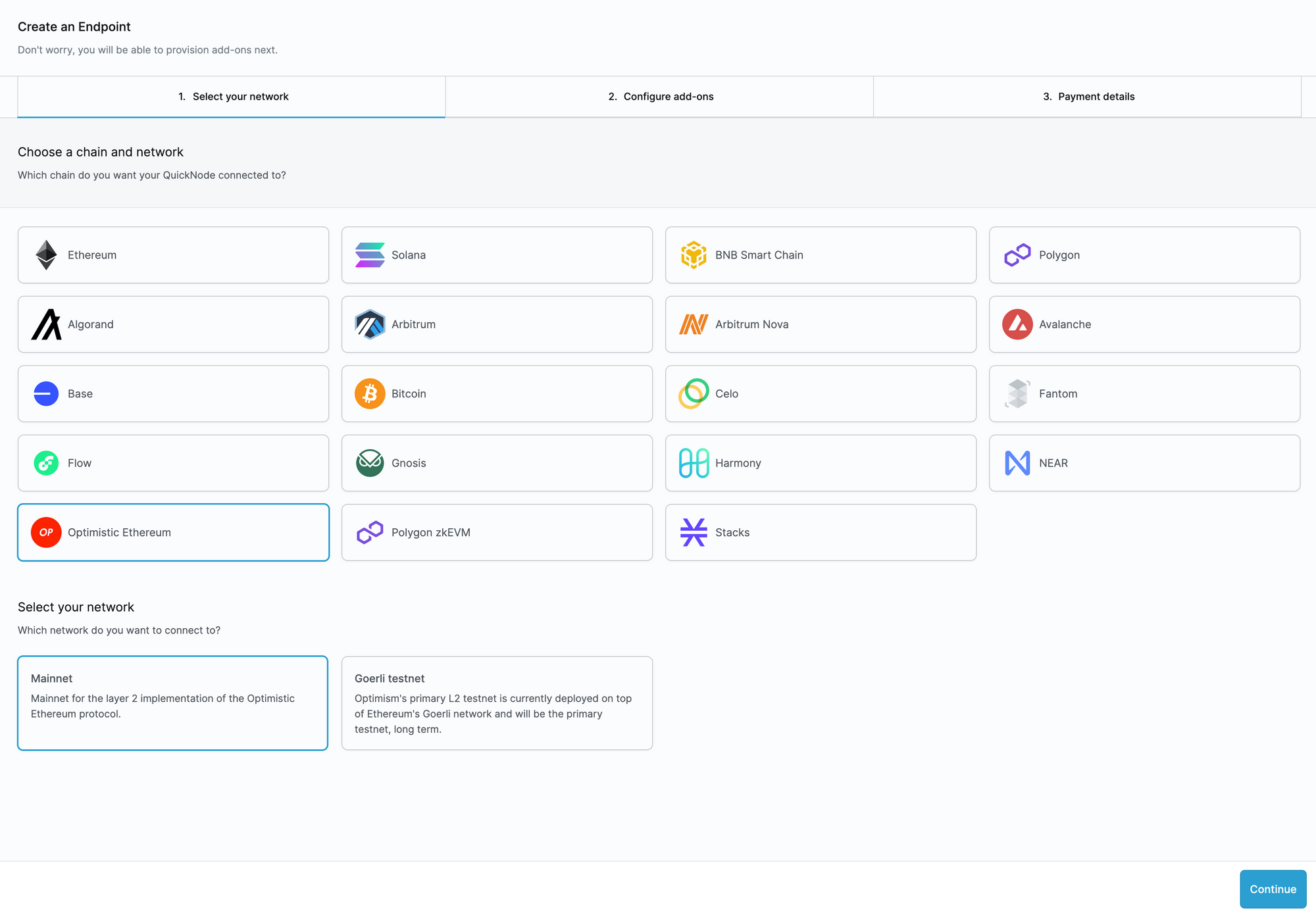4. Select "Optimistic Ethereum" on the next page and any add-ons you require: