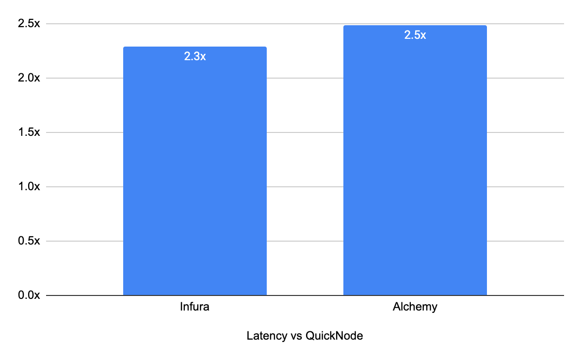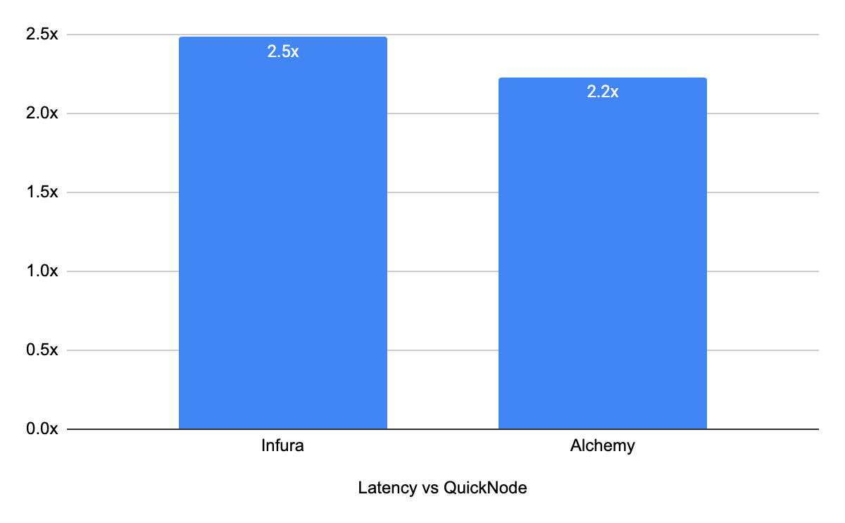 On average, the difference in latency between QuickNode and the other two providers was 2.4x.