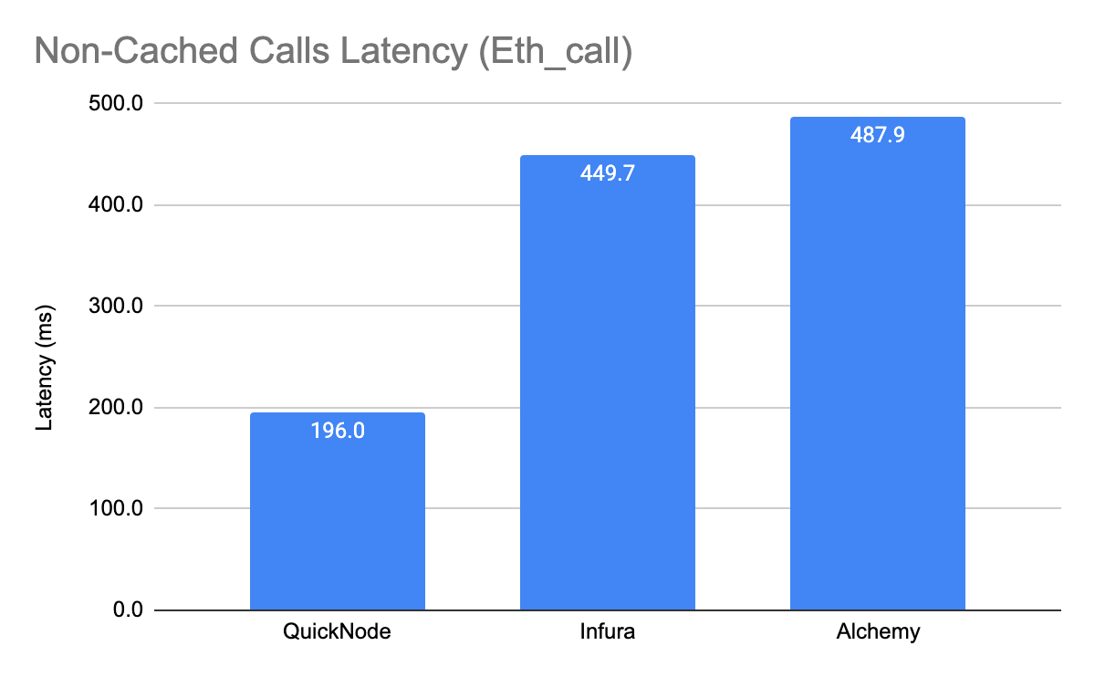 On average, the difference in latency between QuickNode and the other two providers was 2.4x for cached calls.