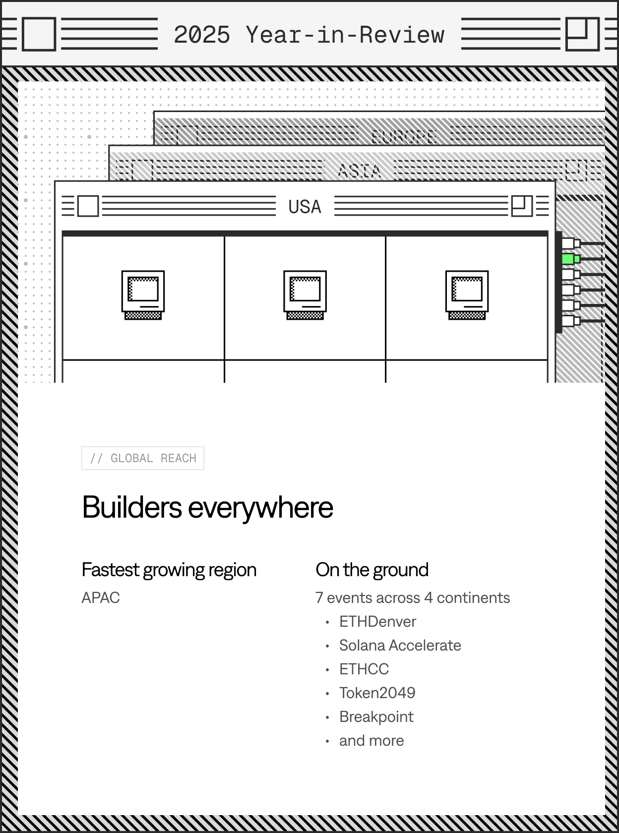- On-the-ground presence: 7 events across 4 continents — ETHDenver, Solana Accelerate, ETHCC, Token2049, Breakpoint, and more...