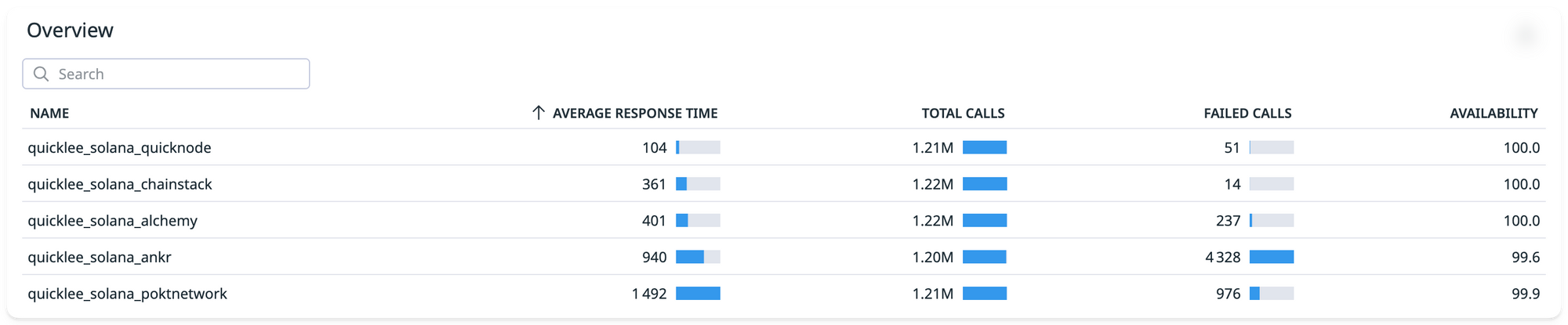 In terms of availability, all providers were able to hit the 99.9% mark, except for Ankr (99.6%). Chainstack and QuickNode had the least failed calls, with 14 and 51 calls, respectively.
