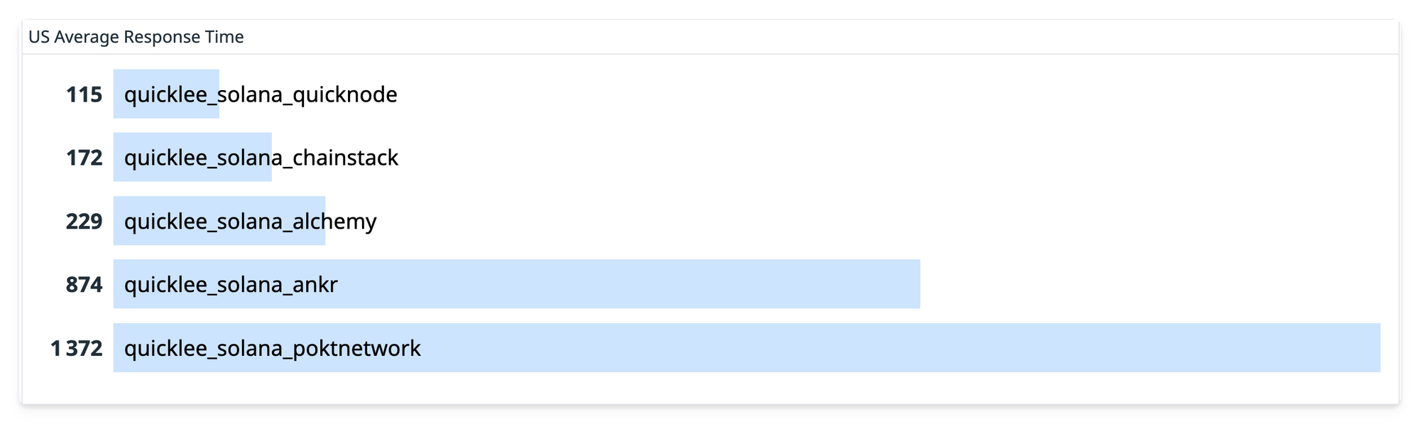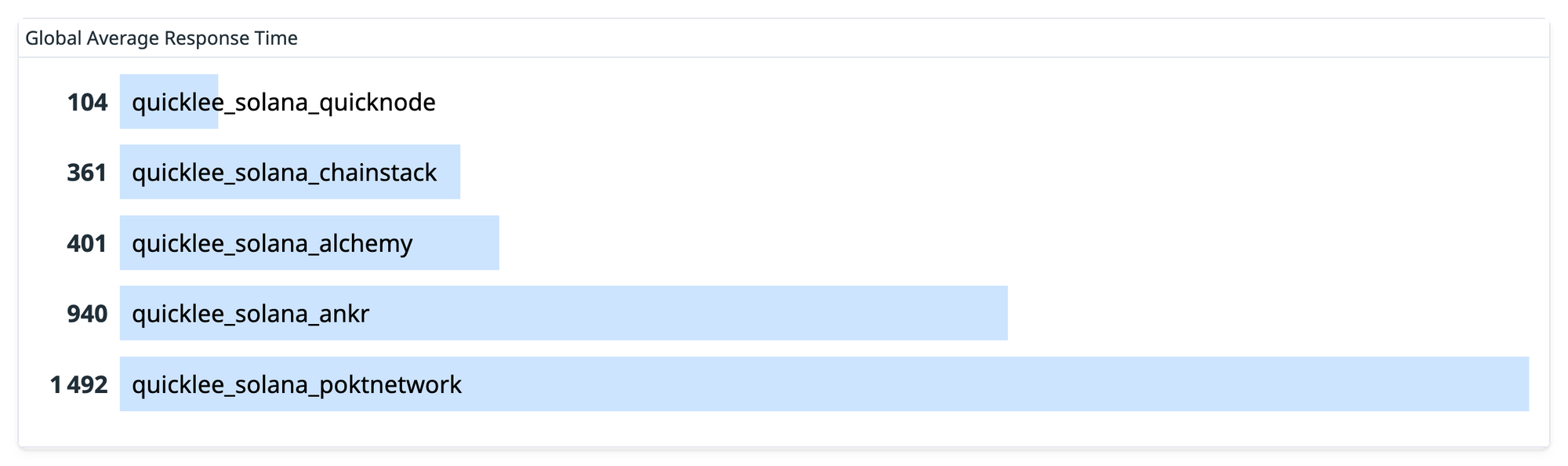 QuickNode had the fastest global average response time at 104 ms, followed by Chainstack and Alchemy with 361 ms and 401 ms, respectively. Overall, QuickNode was almost 3.5x faster than the next best provider.