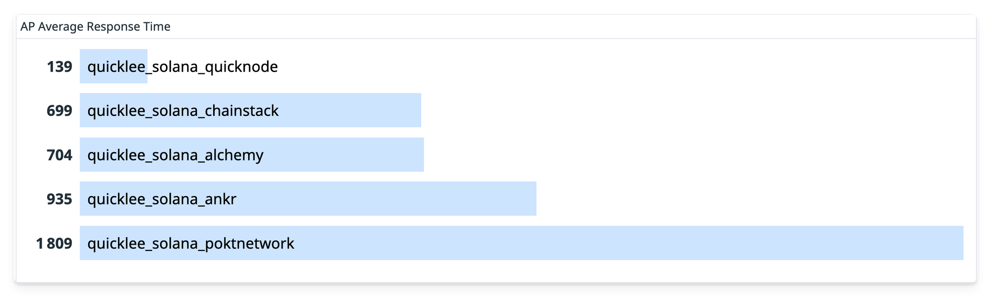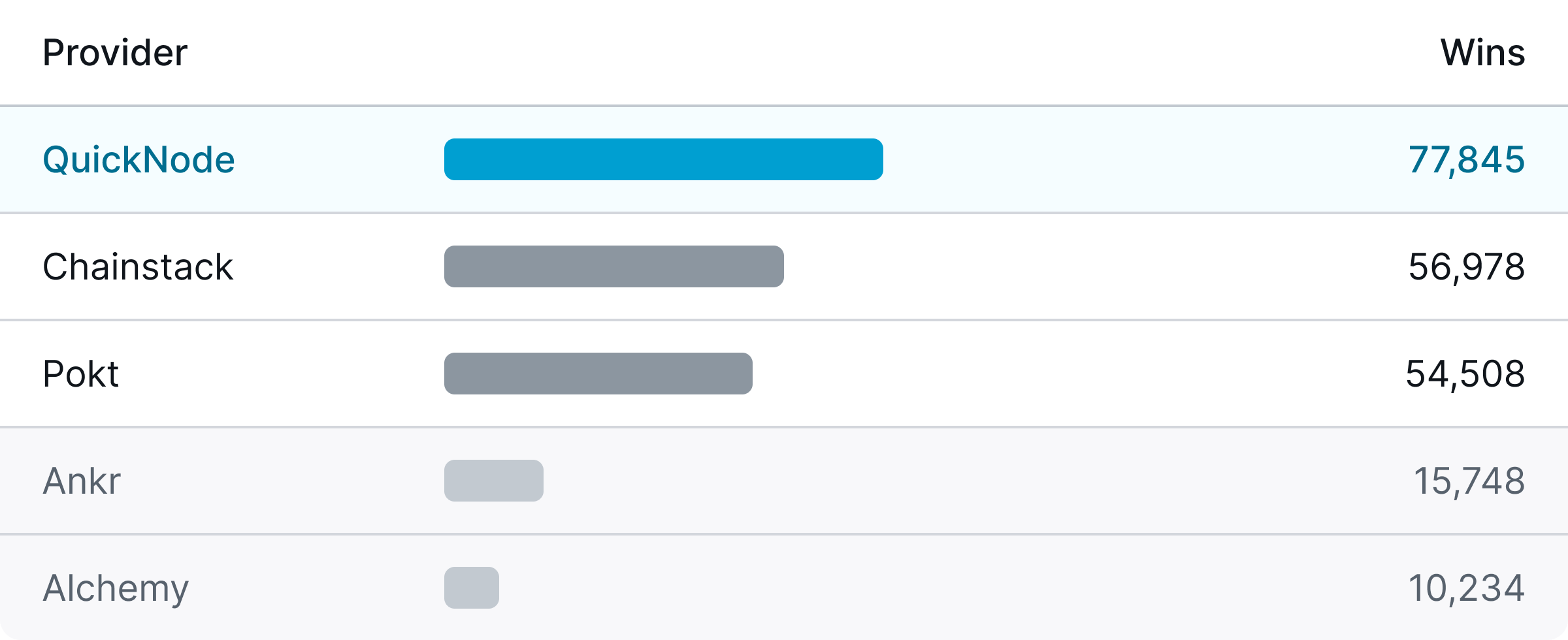 For the latest available slot data, QuickNode won the most rounds with 77,845 wins, followed by Chainstack with 56,978 wins, and Pokt Network with 54,508 wins. This means that out of every 100 calls, QuickNode provides the latest slot data 78 times.