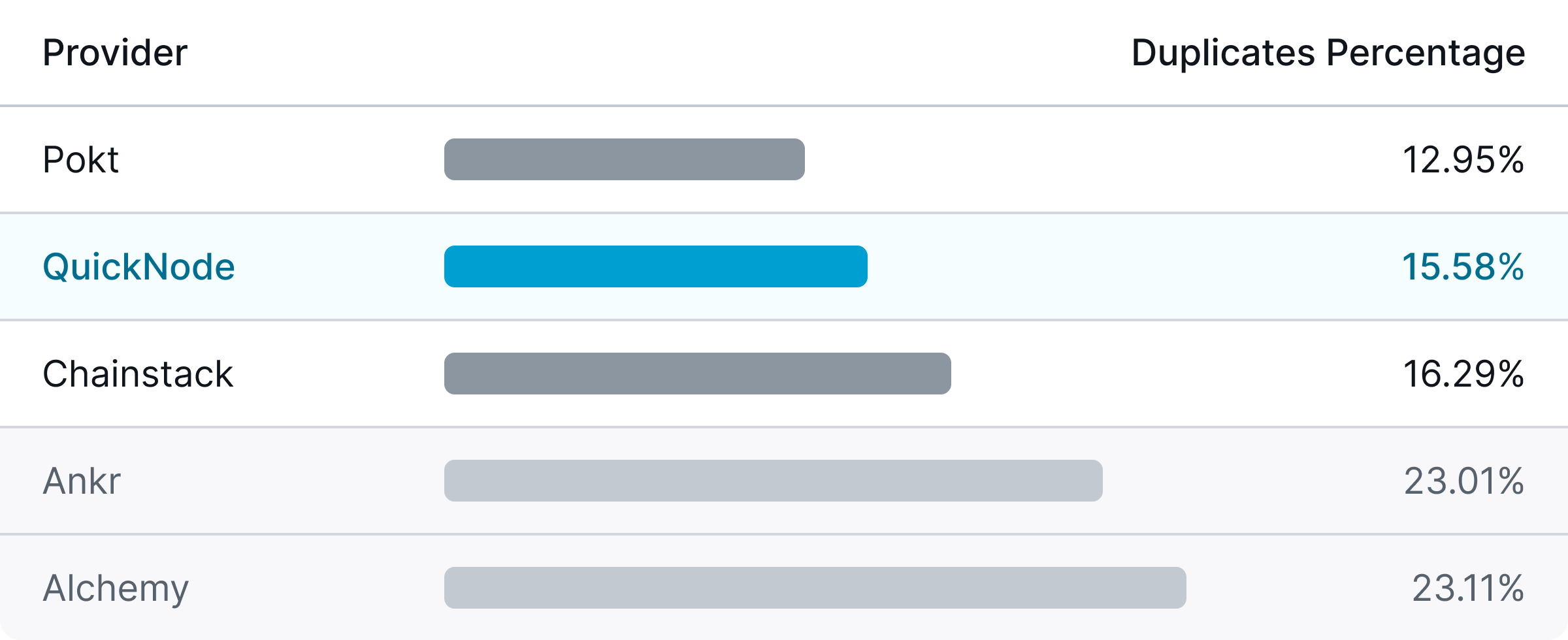 Combining all three factors, QuickNode had the most wins with negligible timeouts and fewer duplicates compared to the others, exhibiting superior data reliability. Chainstack loosely followed QuickNode in terms of data reliability with fewer wins, similar timeouts, and duplicate percentages.