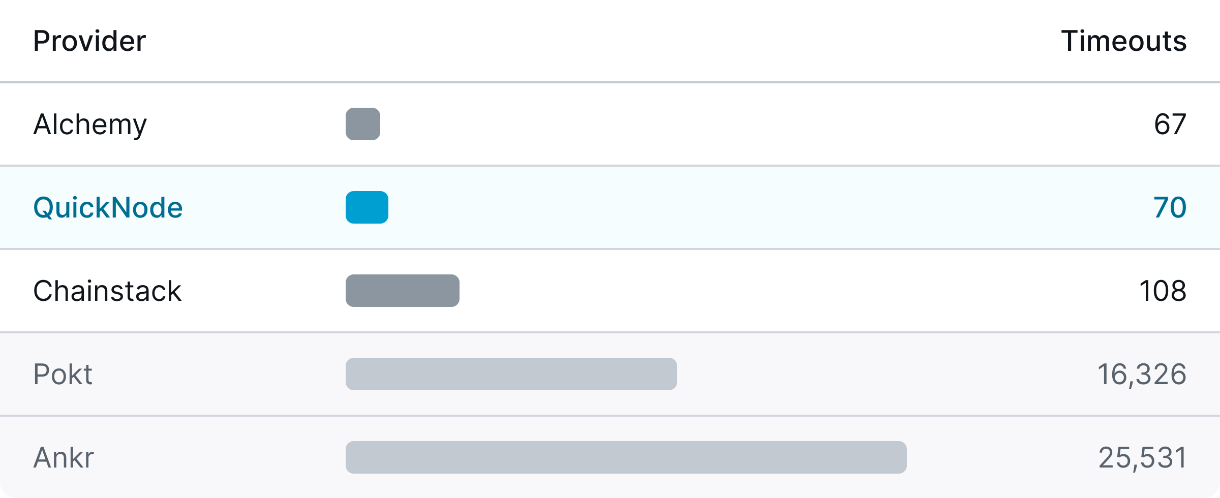 Timeout results were similar, with Alchemy timing out the least with 67 calls, followed by QuickNode with 70 calls, and Chainstack with 108 calls. Pokt Network timed out 16,326 calls and Ankr timed out 25,531 calls, meaning they timed out 20-30 times out of every 100 calls, demonstrating substantial lag in sending the latest data.
