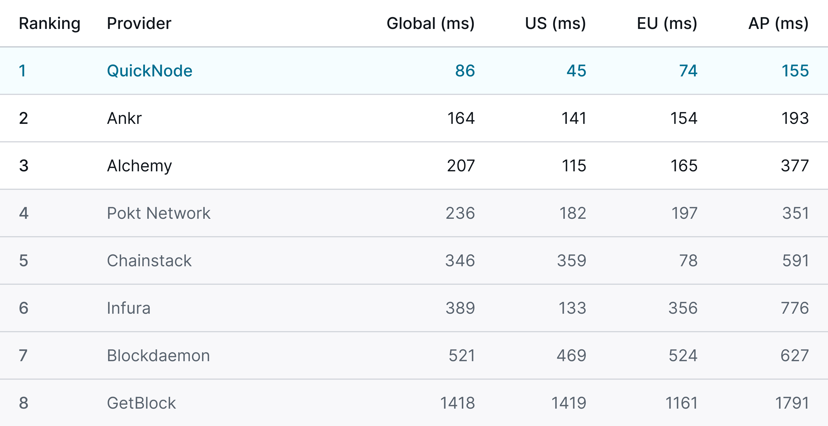 QuickNode was also the quickest provider across all regions, with an average response time of 115 ms, 54 ms, and 139 ms in the US, EU, and AP, respectively.