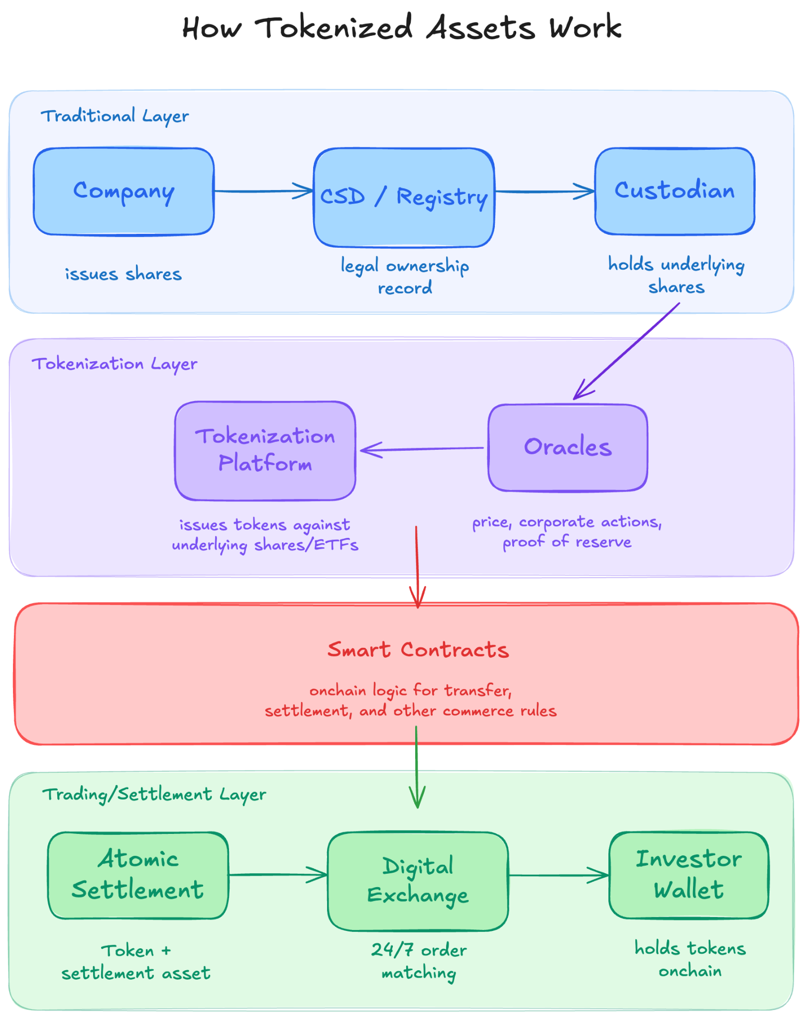 Tokenized equities connect two very different systems: traditional capital markets where assets originate, and blockchains where they move and settle.