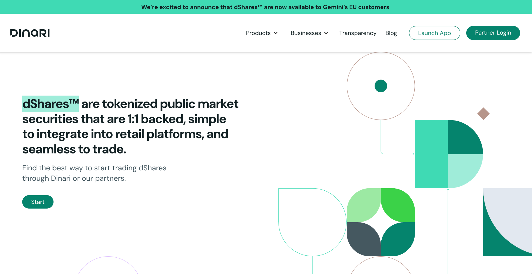 Dinari operates as an SEC-registered broker-dealer and transfer agent, issuing tokenized equities (“dShares”) backed 1:1 by real shares.