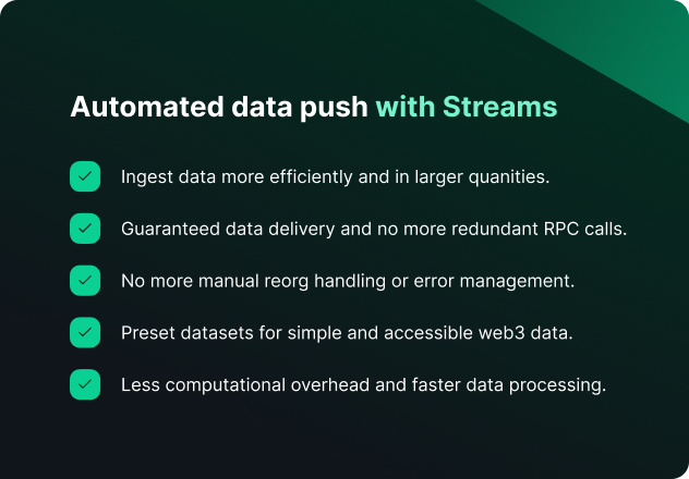 Streams, combined with Functions, create a powerful blockchain ETL solution capable enough to process web3 data with the efficiency and speed developers are used to in web2.