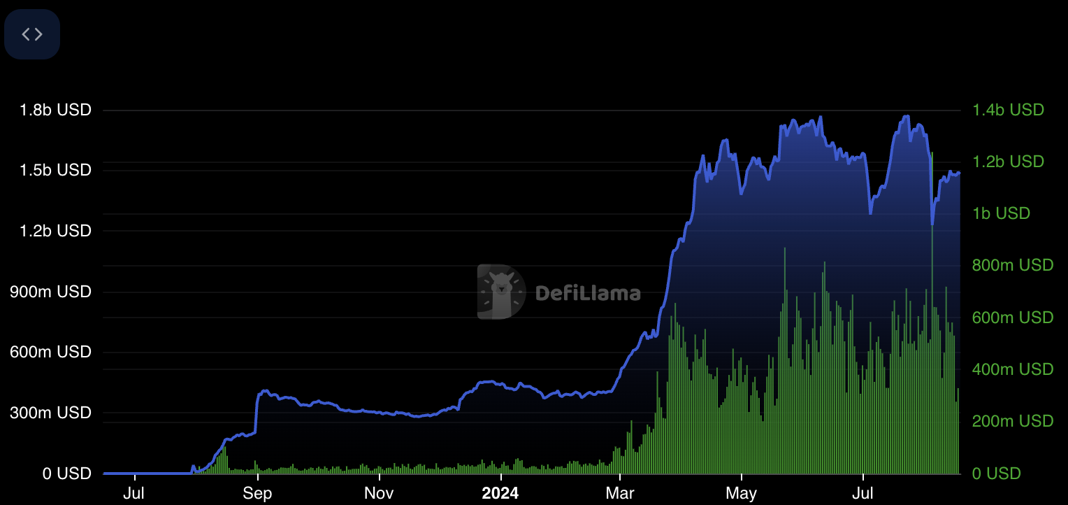 Base similarly peaked on August 4th, recording a TVL of $1.23 billion and token volume of $1.24 billion USD: