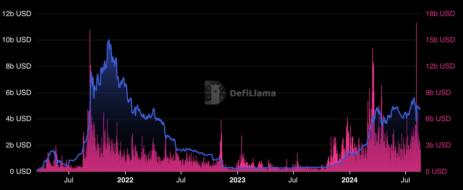 Solana reached a 2024 peak on August 4th, with a TVL of $3.81 billion and a token volume of $5.26 billion USD: