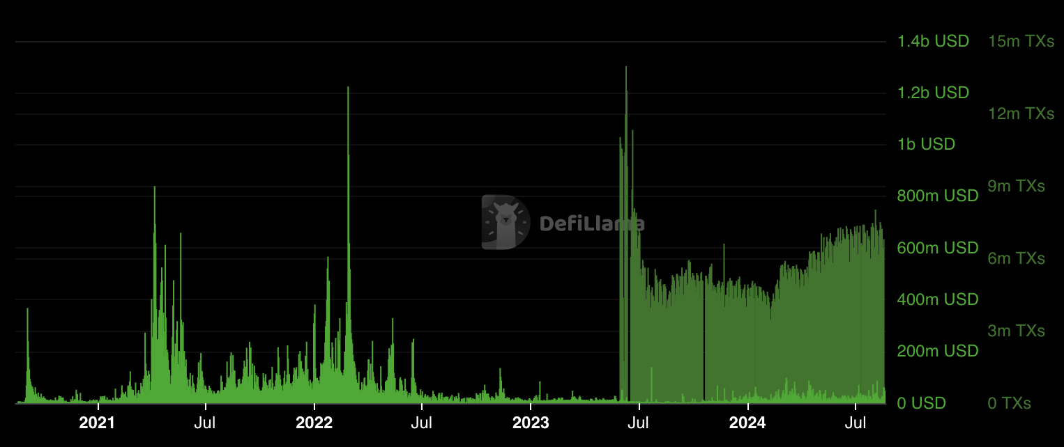 While Tron's current TVL hasn't yet reached its 2022 peak, the summer of 2024 has seen a substantial increase in both volume and transaction count.
