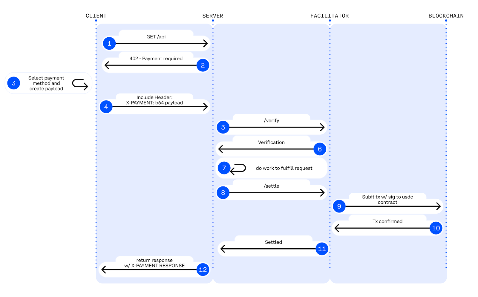 The x402 flow extends a normal HTTP request–response cycle with one new step: a payment handshake that’s cryptographically verifiable onchain.